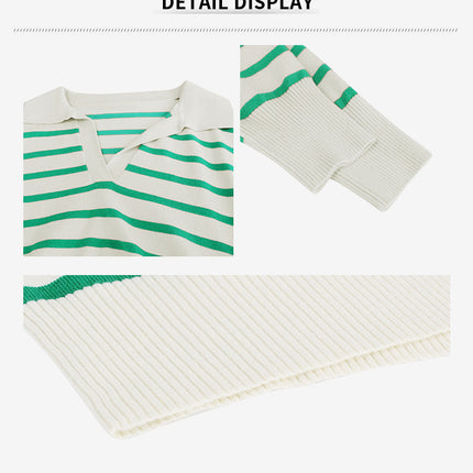 Women Striped Long Sleeve Pullover Sweater Casual Loose Polo V Neck Color Block Lightweight Knitted Fall Shirts Tops